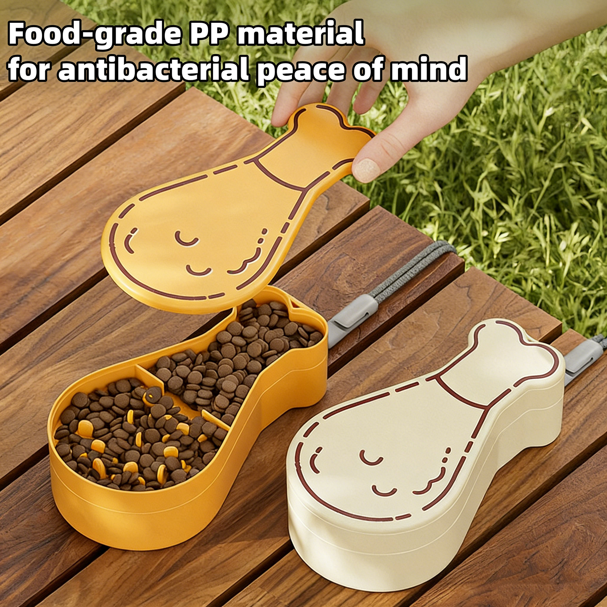 • Cartoon Pet Travel Water Cup: Combines a 6.76 Oz water bottle + 3.17 Oz chicken-leg-shaped PP food holder—perfect for dogs and cats!
